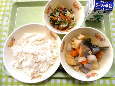 今日の給食のメニューは、麦ごはん、牛乳、味噌おでん、いそか炒めでした。