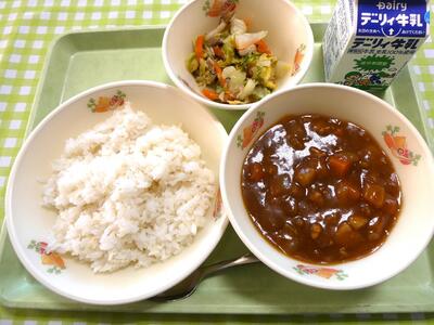 今日の給食のメニューは、麦ごはん、牛乳、チキンカレー、白菜のソテーでした。