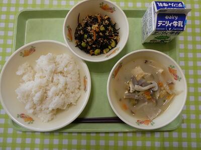 今日の給食のメニューは、麦ごはん、牛乳、けんちん汁、キムタクごはんの具でした。