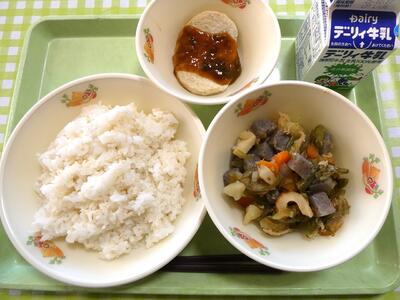 今日の給食のメニューは、麦ごはん、牛乳、鳴門煮、豆腐ハンバーグてりやきソースでした。