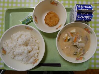 今日の給食のメニューは、麦ごはん、牛乳、豆乳キムチ汁、チキンカツでした。