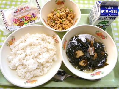 今日の給食のメニューは、麦ごはん、牛乳、わかめスープ、三色そぼろ丼、クレープ(チョコ)でした。