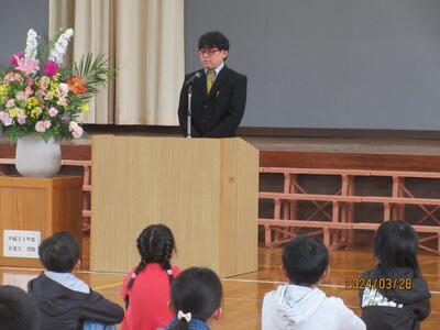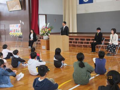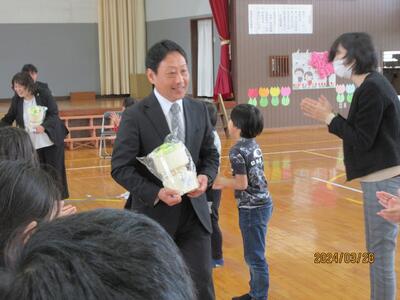 3月28日(木)、離任式が行われました。今年度は計6名の先生方が転出・退職します。子どもたちのために頑張りぬいた先生たちが、本校を離れることに寂しい気持ちは尽きませんが、4月からの新しい場所で、健康で、そして元気に活躍されることを願っています。