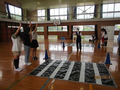 講師の串間市消防署員の方のお話を聞き、空のペットボトルを活用した浮き方や、おぼれている人へのペットボトルの渡し方など、実際の動きを通して学びました。