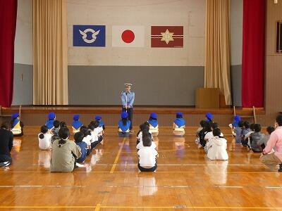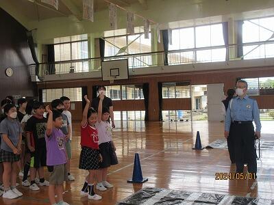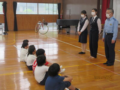 5月1日(水)串間市警察署 交通安全協会の方に来ていただき、交通安全教室を行いました。初めに、1・2年生が横断歩道の渡り方、その後、3年生~6年生も自転車の点検の仕方と横断歩道の渡り方を教えていただきました。雨天でしたが、体育館に横断歩道に見立てた器具を準備していただき道路の横断の仕方の練習をすることができました。