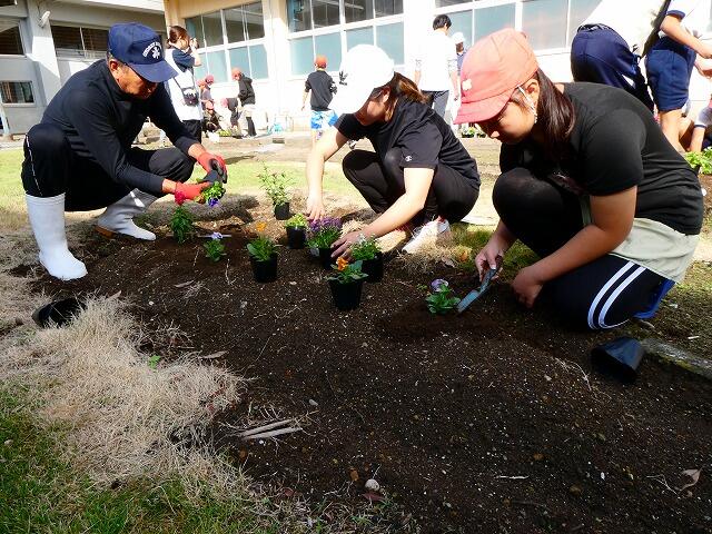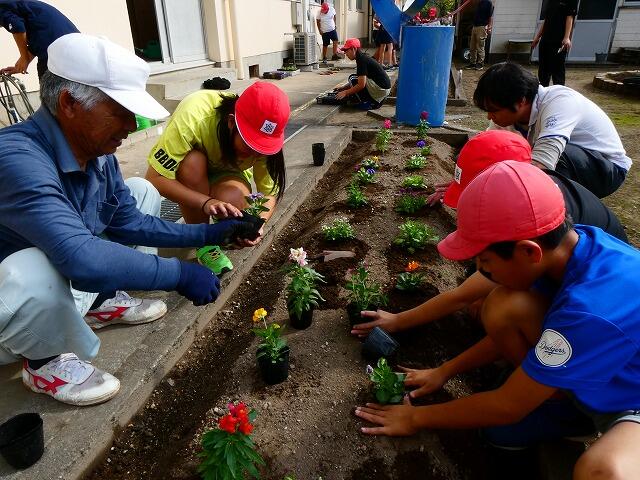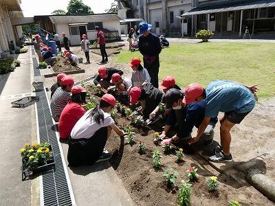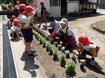 5月10日(木)は「グリーンタイム」の時間を設定し学校園、学級園の花の苗を植えました。地域の方も6名参加していただき全校児童と一緒に作業をしていただきました。各学級でサルビアやメランポジウム、ニチニチソウなどを植えました。地域の方に植え方を教わったり一緒に作業をしたりきれいな学級園を作りました。毎日、水やり等のお世話をしてもっときれいに咲かせます。