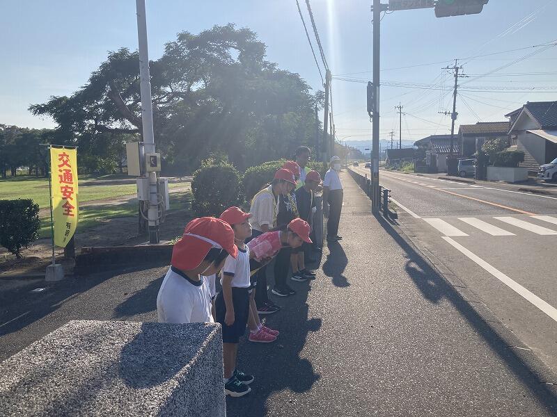 本年度は、金谷小、都井小、本城小、有明小学校の4校合同で修学旅行に行っています。朝は、有明小学校の前の道路をバスが通過するときに、登校してきた子どもたちと手を振りました。