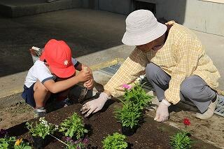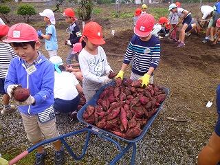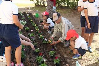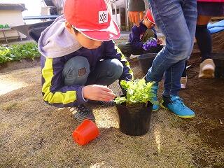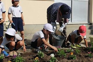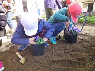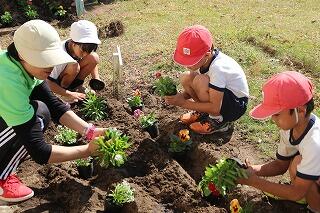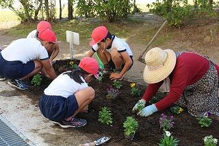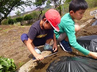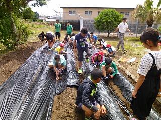 9日(水)2年生と6年生で、畑にイモの苗を植えました。2年生はサツマイモ、6年生はジャガイモを植えました。まずは、うねにシートをかぶせる作業です。風が強くて、シートがとばされそうになりましたが、しっかり土で固めました。6年生が、たくさん土を運んできたり、2年生のお世話をしてくれたりしていました。シートをかぶせたら、苗を植えます。サツマイモの苗は、斜めにしっかり植えるのが難しかったようです。畑の作業が終わると、今度は2年生だけで、ミニトマトの苗を植木鉢に植えました。1年生のときに、花の苗を植えたことがあるので、みんな上手にできました。これからしっかりお世話をして、大きく育てていきたいと思います。