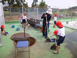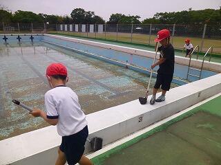 17日(木)全校でプール清掃を行いました。午前中1・2年生でプールサイドをはきました。18名という少ない人数でしたが、ほうき・ちりとりを手に取り、一生懸命つもった灰や砂、杉の葉などを集めていきました。午後からは、3~6年生がデッキブラシやバケツをもって、プールの中まで掃除しました。プールの底に溜まった灰や砂を取り除くのは、とても力がいる作業でしたが、6年生が中心になって掃除をしてくれました。他の学年も何度もバケツで水を運んだり、プールサイドのぬめりをこすったりと、一人一人が自分の仕事を一生懸命取り組んでいました。とても日差しが強かったので、たまに水がかかると歓声が上がりました。プール開きは6月です。きれいになったプールを見て、ますます水泳の授業が楽しみになった子ども達でした。