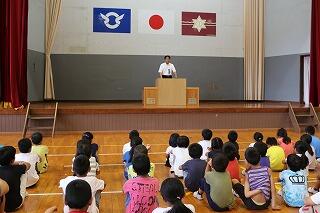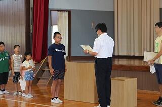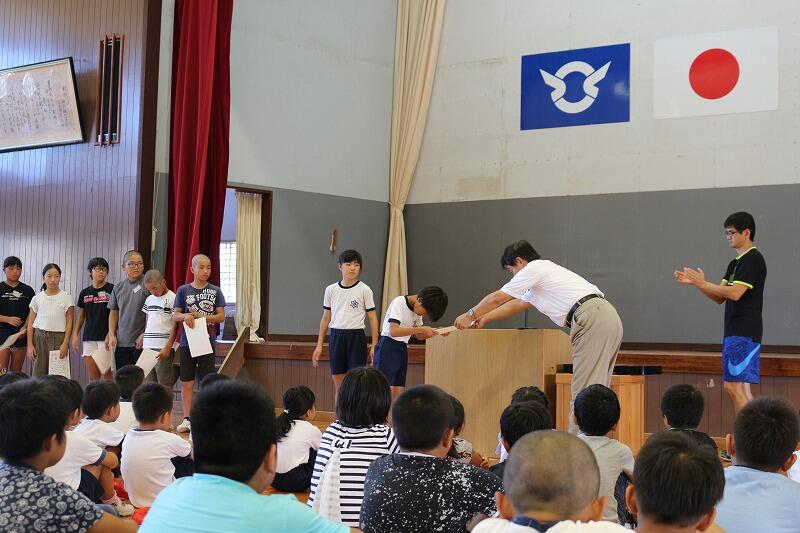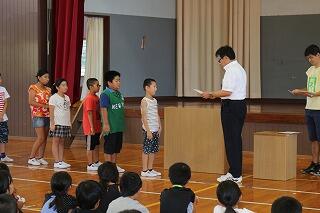 9月3日に全校朝会がありました。そこで夏休みに開催された串間市水泳教室で優秀な成績を残した児童へ校長先生から賞状を授与しました。みんな堂々とした泳ぎで大活躍の水泳教室を思い出すような態度で賞状を受け取っていました。