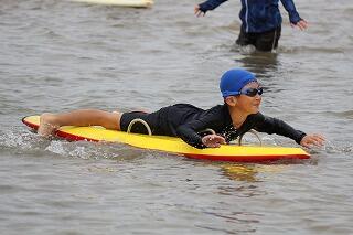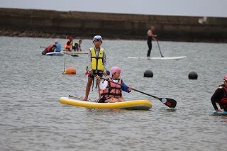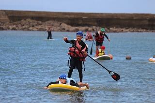 次に、下学年と上学年がバディを組んで、SUP体験とライフセービング体験にわかれて行いました。 SUP体験では、上学年の子がオールを漕いでボードを操縦していました。あっという間に、海水浴場の向かい側にある島までたどり着いた組もあれば、なかなか進まず風や波に流されてしまう組もいました。ライフセービング体験では、走ったり、サーフボードを使ったリレーをしたりしました。休憩中に、ヒトデやナマコなど海の生き物を見つける子もいました。