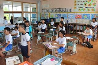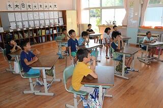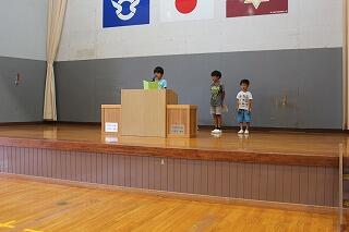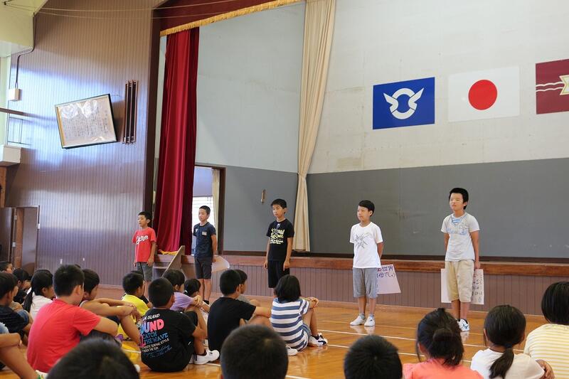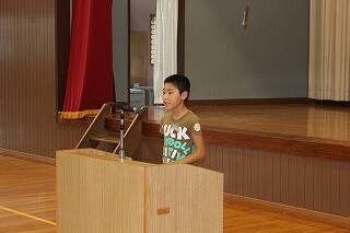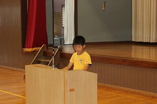 始業式では、2,4,6年生の代表児童が2学期の目標を発表しました。「本を100冊読みたい」「家の手伝いをがんばりたい」「運動会では、団長としてみんなをまとめていきたい」など、自分のことをしっかりと見つめた目標を立てることができました。