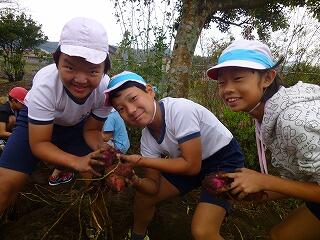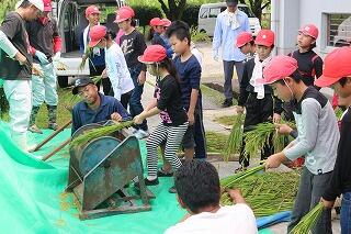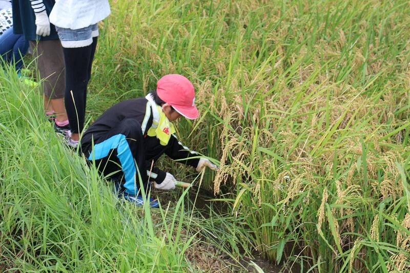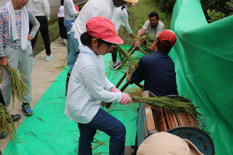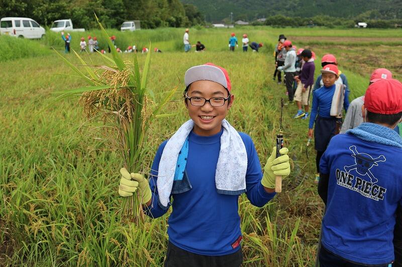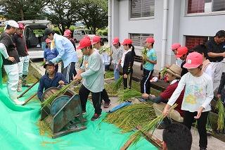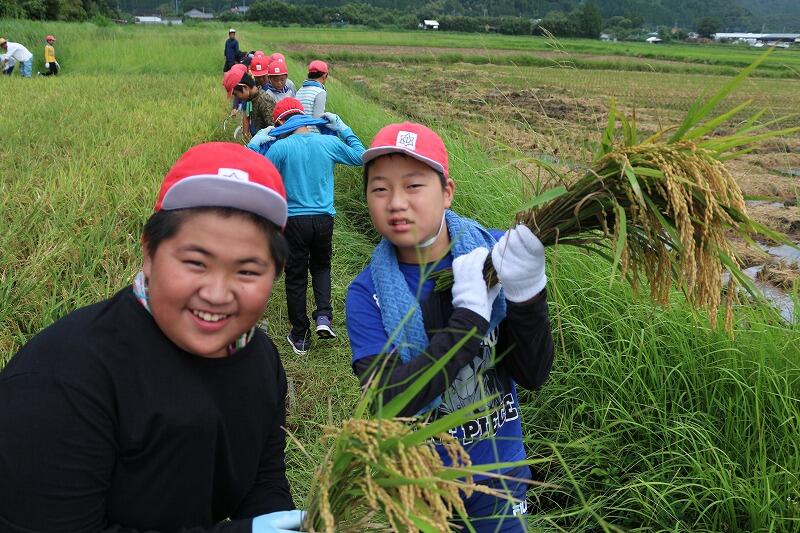 7月31日の授業日に計画した4~6年生による稲刈りが計画通り実施できた。台風の影響で実施が心配されましたが、稲刈りの時間は見事天候が良好でした。子どもたちも一所懸命頑張って活動できました。JAはまゆうの方、青年団の方々に刈り方や脱穀の仕方のご指導本当にありがとうございました。感謝です。今回のお米で12月に行われるもちつきが楽しみです!!