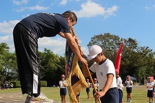 それぞれの団長に校長先生から団旗が授与され、重責にそれぞれ緊張していたようです。その後は、各団に分かれ、団長・リーダーの紹介や抱負が発表し、大きなかけ声で締めくくりました。