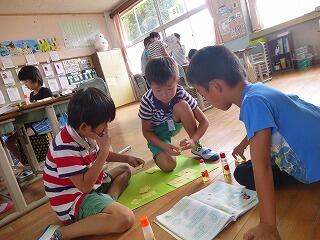 昨日から2学期が始まりました。朝、たくさんの荷物を持って登校してきた子ども達。今年は、暑さが厳しく大変だったのではないかと思いますが、子ども達はみんな元気。教室に入ると、久しぶりの友達と会話が弾んだようです。また、工作を見せ合いながら、みんなで仲良く遊んでいました。