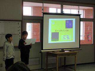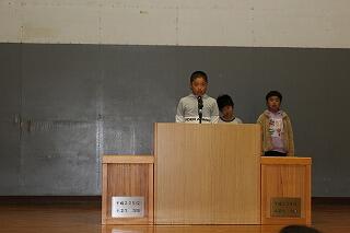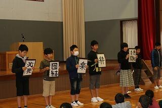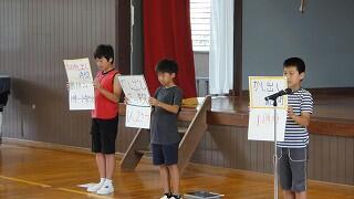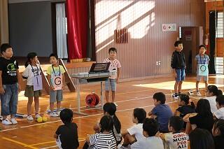 今月は、3年生と体育委員会の発表がありました。3年生は、みんな真剣に詩の群読をして、合奏・合唱をきれいなハーモニーを奏でていました。体育委員会はクイズ形式で運動会などの問題を出して盛り上げました。