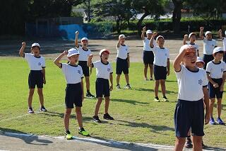 2学期が始まると、すぐに運動会の練習が始まります。各団とも運動会のスローガン「仲間と力を合わせて あきらめずに めざせ W優勝」を胸に精一杯がんばってほしいです。