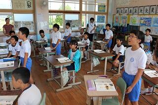 今日は、1学期最後の日、終業式でした。まず、3名の児童の作文発表がありました。それぞれ、できるようになったことや、反省し自分の行いを正していったことなど、1学期の様子をよくふり返った発表でした。次に、校長先生のお話がありました。校長先生から、毎朝がんばって登校している6年生全員に「スマイル賞」が授与され、子ども達は思わずにっこり。校長先生からも1学期がんばったことを紹介していただきました。最後は、夏休みの過ごし方について生徒指導主事の先生の話と、保健室の先生から熱中症対策を心がけることの話がありました。