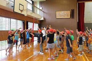 有明小では、計画的に朝の活動で全校一斉の体力向上に取り組んでいます。今回は、話合いの後に班ごとにボールをわたしていく運動で体力向上を図りました。