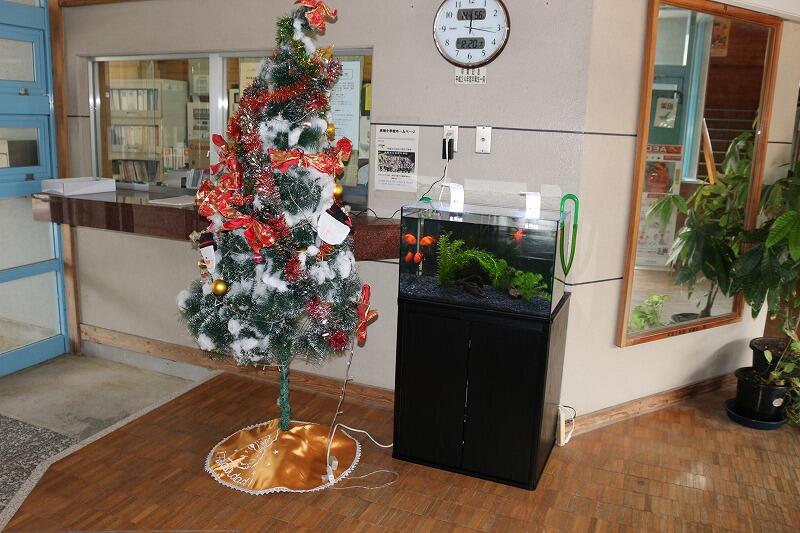 本校の玄関に、かわいいクリスマスツリーと金魚がいます。子どもたちも大喜び。来校者を笑顔にしてくれています。ぜひ、来校して直接ごらんください。