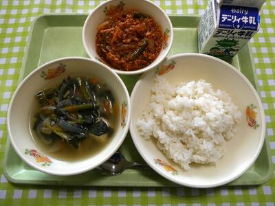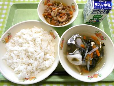 今日の給食のメニューは、牛乳、麦ごはん、豆乳味噌汁、鶏肉の甘辛炒めでした。