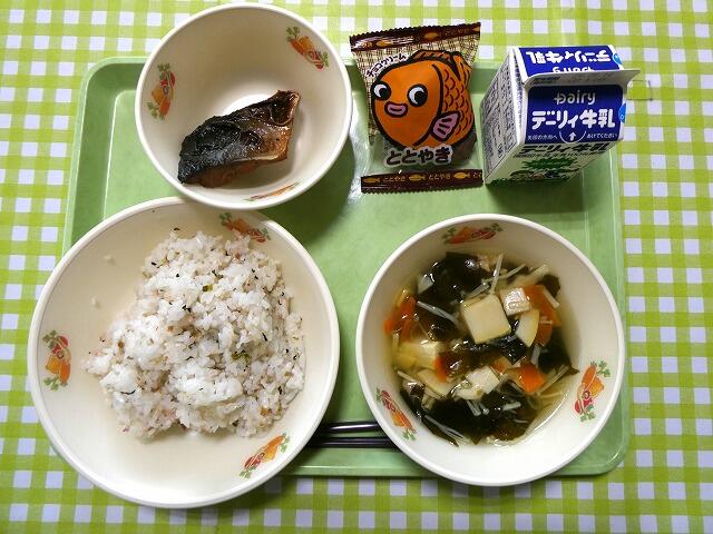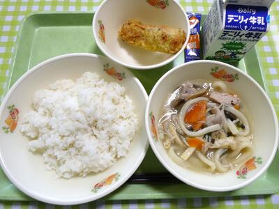 今日の給食のメニューは、牛乳、減量麦ごはん、山菜うどん、ちくわの磯部揚げ、せとふうみ(ふりかけ)でした。