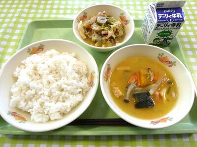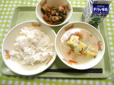 今日の給食のメニューは、牛乳、麦ごはん、かぼちゃの味噌汁、鶏肉と野菜のうま塩炒めでした。