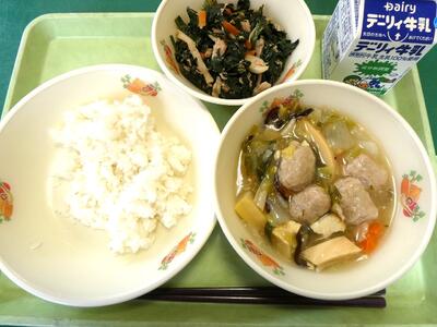 今日の給食のメニューは、牛乳、麦ごはん、肉だんごの中華煮、ほうれんそうとツナのソーーでした。