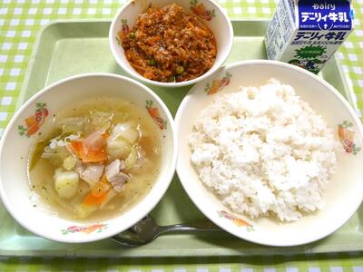 今日の給食のメニューは、牛乳、麦ごはん、コンソメスープ、ドライカレーでした。