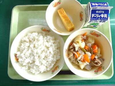 今日の給食のメニューは、牛乳、麦ごはん、肉じゃが、厚焼きたまごでした。