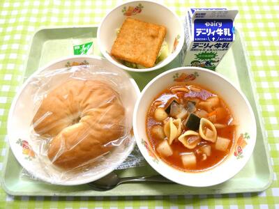 今日の給食のメニューは、牛乳、バーガーパン、ミネストローネ、フィッシュポーション、ゆでキャベツ、タルタルソースでした。