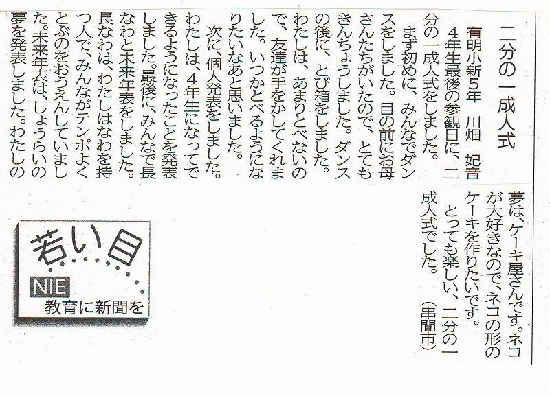 宮崎日日新聞の「若い目」に西村秋伸くんの作文が掲載されました。