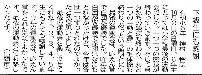 6年生神村怜奈さんの作文が宮日新聞10月20日付に掲載されました。