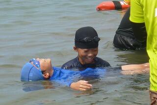 7月11日(月)の午前中、低・中・高学年に分かれて、着衣泳の指導を行いました。この活動は、毎年この時期に行っており、アクシデントが起きて、服を着たまま水中に投げ出されたら、どうすればよいかを考えたり、体験したりする活動です。合言葉にしている「浮いて待つ」を中心に体験をしました。子どもたちは、上手に浮くことができていました。