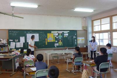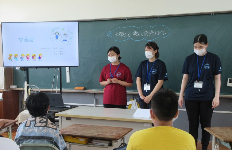 7月11日(月)、南九州大学人間発達学部3年生の学生3名が本校を訪問しました。3名は教師を目指しており、今回は、ゼミの授業の一環での来校でした。3校時は着衣泳の授業を参観、4校時は準備してきたプレゼンで5年生の子どもたちに、自己紹介や大学生活の様子などを教えてくれました。5年生から質問を受けたり、昼休みは一緒に遊んだりしながら短い時間を過ごしていました。