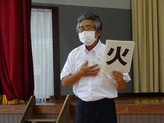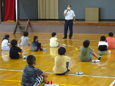 8月31日、串間警察署の方2名にご協力いただき、不審者対応訓練を行いました。今回の訓練は、子どもたちへの配慮として、不審者役をする警察官の方を事前に紹介したうえで訓練を始めました。教室棟1Fの犬走り付近から、校舎内に不審者が侵入する流れでしたが、子どもたちは、おしゃべり厳禁という約束のもと、教師の指示に従って適切に行動することができました。事後の反省では、体育館で警察署の方の話を聞きながら、登下校時のことも含め、もしもの時の動きを確かめることができました。また、職員は、約20年前の大阪教育大学附属池田小学校の事例を振り返るとともに、警察署の方の具体的な助言をもとに、危機意識の継続と児童を守る行動の在り方について考えることができました。