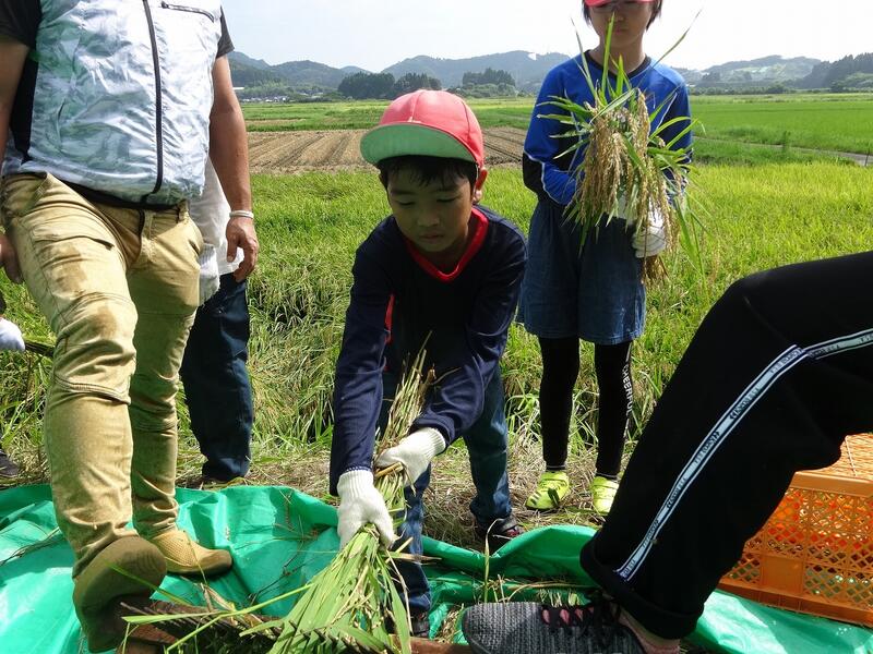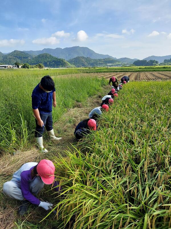 8月4日、今年もJAの方々のご協力を得ながら稲刈り体験が実施されました。体験したのは4・5・6年生です。鎌を使った稲刈りのため、使い方のコツを掴みながら一株ずつ丁寧に刈り取っていました。また、その場で、準備された足踏み脱穀機や千歯こきを使い脱穀も行うことができました。熱中症対策で時間を短縮して行いましたが、田植え時に5本ずつ植えた苗が、株を増やし大きく育ったことを実感しながら活動することができました。ご協力くださった方々に感謝いたします。