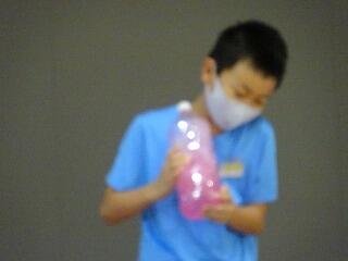 8月31日(水)の朝の活動時間に、運動会に向けての結団式を行いました。団決定は、副団長さんがクルクルバット(バットに頭を付けてクルクルと10回回る)、団長さんがバスケットのシュートを行い、早い方がペットボトルを選択し、ペットボトルを振ると中の水が団の色に変わるという方法でした。