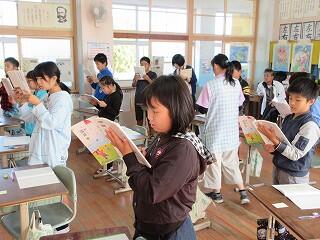 1年生は、擬音語・擬態語を知り・使えるように、5年生は構成メモをもとに表現を工夫して物語を書くという授業でした。