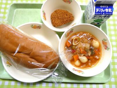 今日の給食のメニューは、黒糖パン、牛乳、ミネストローネ、かぼちゃのひき肉フライでした。