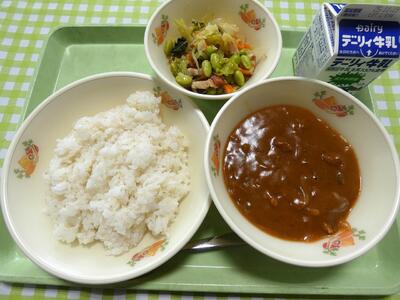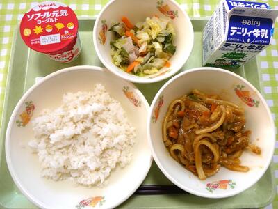 今日の給食のメニューは、減量麦ごはん、カレーうどん、キャベツのソテー、ヨーグルトでした。