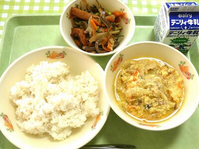 今日の給食のメニューは、麦ごはん、牛乳、親子丼、茎わかめの炒め物でした。