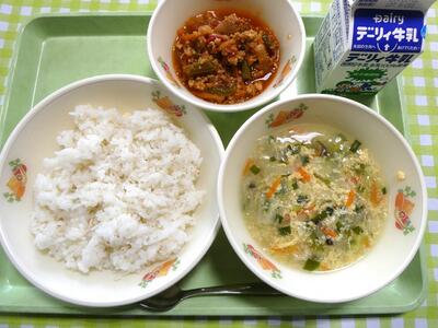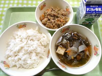 今日の給食のメニューは、麦ごはん、牛乳、もずくスープ、肉みそ丼の具でした。