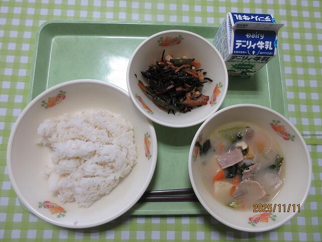今日の給食は、麦ごはん、牛乳、ひじきの炒り煮、豚汁でした。