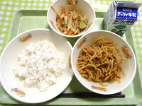 今日の給食のメニューは、減量麦ごはん、牛乳、ジャージャー麺、ごぼうのマヨソテーでした。