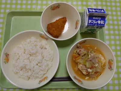 今日の給食は、牛乳、麦ごはん、キムチ鍋、あじフライでした。