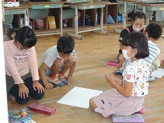 (1年生は、初対面の子どもも多く、自己紹介の後、慣れるためのゲームをして、図工の学習をしました。)