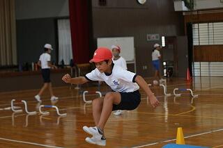(5・6年生は、一緒に陸上記録会に向けての練習に励みました。大変強い風が吹いていたため、体育館での練習でした。)