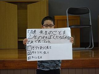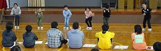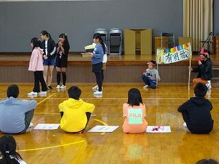 お別れ集会①では、1年から5年生がそれぞれ歌やダンス、劇などの出し物で6年生の卒業をお祝いしました。6年生もお礼の出し物をしました。どの学年も心のこもった出し物で楽しいお別れ集会①になりました。移動した後のお別れ集会②では、子どもたちが計画した遊び(ケイドロ、ドッジボール、じゃんけん陣取り)をして楽しく過ごしました。この遠足には、南九州大学の学生2名も参加していただきました。
