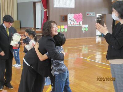 式の後も、先生と子どもたちの間で別れを惜しむ様子が続いていました。